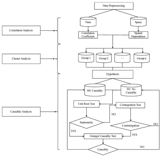 A causal-effect inference method is proposed, and three kinds of econometric and statistical analysis will be performed, namely correlation analysis, cluster analysis, and causality analysis. First, we conducted correlation analyses on the time and space dimensions. Meanwhile, based on the results of the spatial dimension correlation analysis, a clustering analysis of samples was carried out. Then, we selected three kinds of panel data analysis methods: A panel unit root test [,,,], a panel cointegration test [,], and a panel causality test [,,]. The test process can be seen in Figure 1 and contains seven steps in total. The software of the test process is mainly R and ArcGIS in this paper.