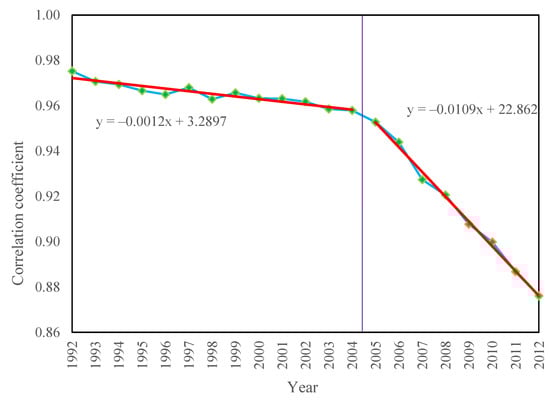 We used annual data from 77 countries to calculate the correlation between global nighttime light intensity and electric power consumption. In the global results, there was indeed a high correlation between them. In the time dimension, the correlation coefficient between nighttime light intensity and electric power consumption decreased year by year (Figure 2). The correlation decreased from 0.98 in 1992 to 0.88 in 2012. From 1992 to 2005, the correlation decreased slightly, and increased in 1997 and 1999. After 2005, the correlation between global nighttime light intensity and electric power consumption decreased faster.
