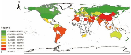 In the spatial dimension, the correlation between them also had spatial heterogeneity. In Southeast Asia, Africa, the Middle East, and South America, the relationship between them was positive. However, in North America and Europe, the relationship between them was negative. The correlation coefficients of developing countries were generally positive and high; China had the highest, at 0.9915. But developed countries were generally low or showed a negative correlation; Canada had the largest negative correlation, at −0.7919; Nordic countries were close to 0; and some European countries near Africa had higher correlation coefficients, such as Spain and Greece (Table 3). Using to the spatial classification method [], we divided the whole sample into seven groups. The results are shown in Figure 3.