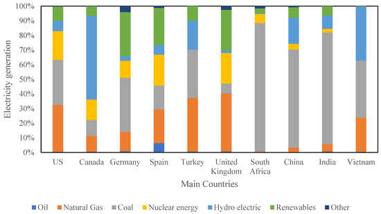 Figure 4. Electric power generation structure in major countries. - Third, there is a spatial spillover effect of nighttime light, near Africa and the Middle East; some European countries have strong positive correlation, such as Portugal, Spain, Turkey, and Ireland, while other European countries have weak or negative correlation (Figure 3).