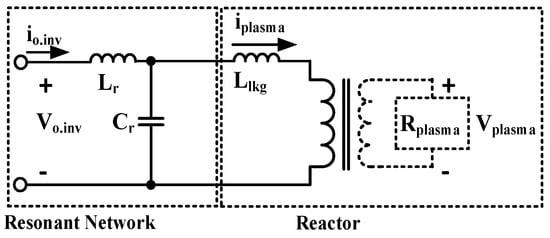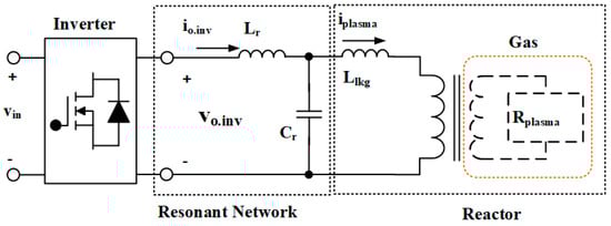 Figure 1 shows the conceptual circuit diagram of the plasma generation system that generates plasma by injecting gas into the reactor of the chamber. In Figure 1, Lr, Cr, Llkg, and Rplasma represent the resonant inductor, resonant capacitor, leakage inductor, and the equivalent resistance of the plasma load, respectively. The “Vin” represents the input voltage of the inverter. vo.inv, io.inv, and iplasma indicate the mean output voltage of the inverter, the output current of the inverter and the output current for generating plasma, respectively. In the plasma generation system, the injected gas affects the load. This plasma generator has unique features: (1) the impedance of the plasma load is proportionally decreased according to the increase in iplasma value [] and (2) the sinusoidal wave is highly recommended for generating plasma []. These characteristics are an important consideration point for designing the power supply of the plasma system.