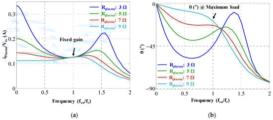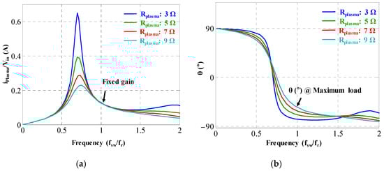 In order to regulate the constant output current while preventing drop-out, the resonant frequency should be selected as an operating frequency of the inverter, and the output current can be derived from impedance analysis, as shown in Equation (2) []. Figure 5a presents the characteristics of output current through the impedance analysis according to frequency variation. As shown in Figure 5a, the output current changes with the load variation, except for the resonant frequency. Therefore, the resonant network should be designed to satisfy the maximum output current value at the resonant frequency in the plasma generation system.