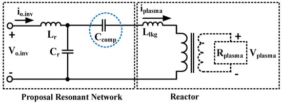 The LC resonant network is suitable for satisfying the constant current output of the plasma inverter with just a few passive elements. However, the LC resonant network is constructed here as the LCL network because of the leakage inductance of the reactor which is used for plasma generation, as shown in Figure 4. Therefore, in order to design the power supply for the plasma generator, the characteristics of the LCL network should be analyzed mathematically. The first consideration point in designing the network using mathematical analysis is deriving the Lr and Cr values, which can regulate the constant output current of the inverter regardless of load variation.