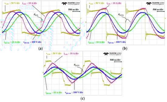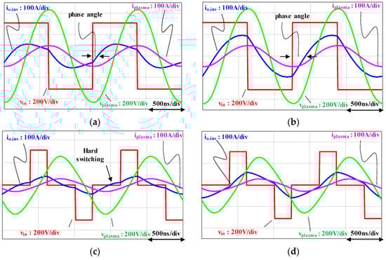 The experiment has been conducted based on the parameters listed in Table 1. Among these parameters, the input voltage 1/3 scale-down model has been used with consideration of the laboratory power distribution. The resonant network has been designed with Equation (2) considering switching frequency and maximum output current. Figure 10a shows the experimental waveform of the LCL network, which represents the narrow phase angle. In this case, it is impossible for iplasma to be controlled with the ZVS region using the phase shift control to obtain a minimum value, as shown in Figure 10a. On the other hand, a sufficient phase angle for the phase shift control in the ZVS region is obtained in the LCCL network, as shown in Figure 10b. In this result, the DC-AC inverter adopting the LCCL network can be operated with ZVS despite the worst case for obtaining the phase angle, as shown in Figure 10c.
