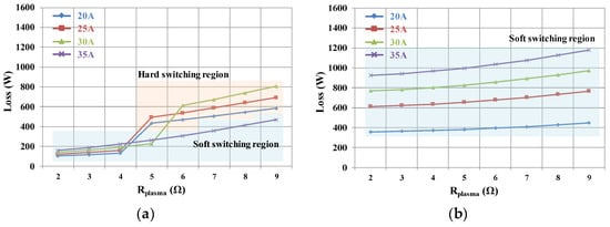 Loss analysis has been conducted to compare the efficiency of each resonant network []. In order to analyze the losses of the inverter, only the switch loss is considered, without any loss of resonant inductor, which consists of an air core inductor and a resonant capacitor. Regarding the analysis results, the loss of the LCL network is smaller than that of the LCCL network in the ZVS operation region under the 20 A output condition, as shown in Figure 9. In the non-ZVS operation region at the 20 A output condition, the loss of the LCL network is larger than that of the LCCL network. Beyond the 25 A output region, the loss of the LCCL network is larger than that of the LCL network because the large inverter current is required in the LCCL network.
