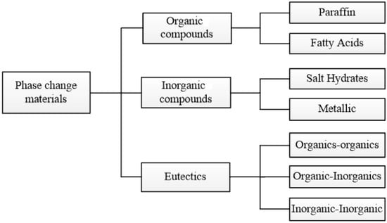 The use of PCMs has recently gained more research interest and importance in the optimal use of energy. The theories, design and analysis of PCMs to store latent heat have been explored thoroughly in the literature [,,,,,,,,,]. Some of the classifications, types and methods will be discussed as follows. Based on their phase change, PCMs can be classified into four different types: solid-solid, solid-liquid, solid-gas and liquid-gas. Of these four types, solid-liquid PCMs are the most suitable for storing thermal energy, and they can be found as organic PCMs, inorganic PCMs and eutectics, as seen in Figure 2 [,].