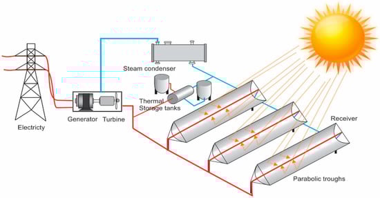 For household use, solar energy is currently the most popular source of renewable power generation in terms of annual investment and offering benefits. There many types of solar energy for power generation, such as photovoltaics, solar thermal [], solar organic Rankine cycle [] as well as a solar hybrid [,]. In this study, solar thermal electricity generating systems (SEGS) will be discussed due to their ability to be used with PCM to store energy. Therefore, they have great dispatchability potential, which means that they can be used on-demand, making them more efficient and cost-effective. However, high-temperature thermal energy storage (TES) systems have not been widely tested; only a few power plants around the world have been identified as examining this system [,]. More recent designs for SEGS have used expensive synthetic oil as storage media and achieved an increase in working temperatures, from the former 300 °C up to 400 °C; however, the technology is still economically infeasible []. An example of PCMs used as the heat storage media for SEGS is illustrated in Figure 4.