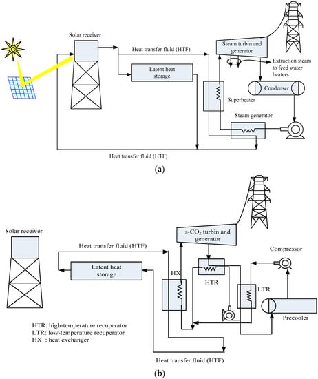Schematic diagram of CST (concentrated solar thermal) power plant with (a) steam Rankine cycle, (b) s-CO2 Brayton cycle.