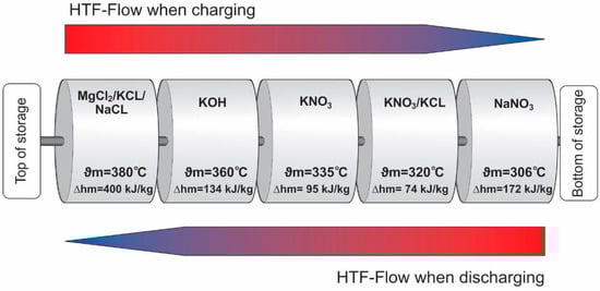 The same concept has been developed for cascaded latent thermal energy storage (CLHS) by Michels and Pitz-Paal []. As shown in Figure 6, CLHS can be used as alternative storage in the parabolic trough where thermal oil is used as a heat transfer fluid. This figure shows that five different PCMs were used in the temperature ranges between 300 °C to 380 °C []. The results show that this system can be adapted to the DS123G plant based on the design and material properties. However, the theoretical concepts have not been experimentally verified.