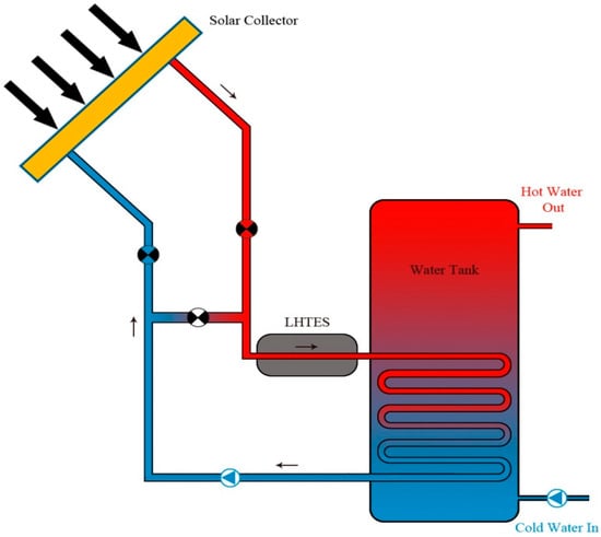 One of the main areas where solar energy has been thoroughly exploitedis in water heating systems. In comparing solar thermal conversion and solar electrical direct conversion, it has been found that solar thermal conversion is more efficient by about 70% compared to 17% for solar electrical direct conversion systems [,]. The hot water is needed for residential, commercial and industrial usage. Solar water heaters have gained attention recently because they are relatively inexpensive, maintenance is easy and they are simple to fabricate. In order to ensure hot water is available throughout the day, PCMs can be used as a means of thermal storage. A typical solar water heating system is usually comprised of two units, which both operate simultaneously: a solar water heater and a PCM-contained heater storage unit. During the day, a water heater normally operates by collecting solar energy to heat the water while at the same time, the PCM absorbs thermal energy and stores it within the material. During the night when sunshine is unavailable, thermal energy is retrieved from the PCM to heat the water. A substantial amount of effort by researchers has been aimed at developing solar water heaters. Various PCMs and thermal storage technologies are readily available for use and development in the solar water heater (LHTES) [,,]. The schematic diagram of an LHTES is presented in Figure 7. The extensive work that has been done on improving the integrated solar water heater storage systems issummarized in Table 2.