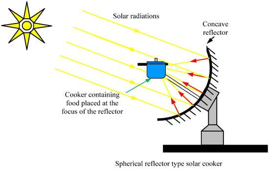One of the main elements of energy consumption in developing countries is cooking. The sources of energy for current cooking methods are kerosene and liquid petroleum gas (LPG) for urban areas, while in rural areas, non-commercial fuels such as firewood, cow dung and agricultural waste, are used. Solar cookers have the potential to solve global issues related to fuel source limitations and CO2 emissions. Hence, more research initiatives are needed to successfully commercialize solar cookers as a viable replacement for traditional cooking devices. The use of solar cookers could have a positive impact on the environment by reducing CO2 emissions and helping to reduce the dependency on fossil fuel. In order to be fully commercialized and widely used, certain social conditions are required in addition to the cost and performance conditions [,,]. Also, usage of solar cookers has a limitation in that they can only be used in clear, sunny conditions and are unusable during cloudy days or at night. Thus, solar cookers must have the ability to store heat to overcome these limitations and impracticalities during off-sunshine hours. Research and promotional schemes in the PCM field are necessary to ensure that solar cookers are viable and commercialized for future use [,,]. The schematic diagram of a concentrating type solar cooker using PCM A-164 is presented in Figure 8.