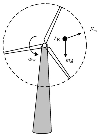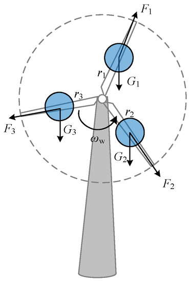 The research object of this paper is the 3-blade DFIG WT; Figure 1 is a schematic diagram of the 3-bladed WT. Each blade can be equivocated to a mass block with a distance of ri (i = 1, 2, 3) to the hub center and a mass of mi (i = 1, 2, 3). In Figure 1, Gi and Fi (i = 1, 2, 3) represent the gravity and centrifugal force of each blade, respectively. Under normal conditions, these three blades are equal in gravity and the centrifugal force. Since the centrifugal force intersects the axis of the hub center perpendicularly, the rotational torque of the rotor is not affected. The three blades have geometrical symmetry, so when the rotor rotates at angular velocity, , the torque generated by the gravity of the three blades is zero: