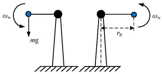 Figure 2 is a schematic diagram of the mass imbalance of a single blade of a WT. The equivalent mass block, m, rotates with the blade at a speed of , and the gravitational torque generated by it can cause fluctuations in the rotational speed of the main shaft. As shown in Figure 3, the mass imbalance will accelerate the rotational speed of the main shaft during the downward rotation from the top to the bottom and will decelerate the main shaft as the blade rotates from the bottom up to the top.