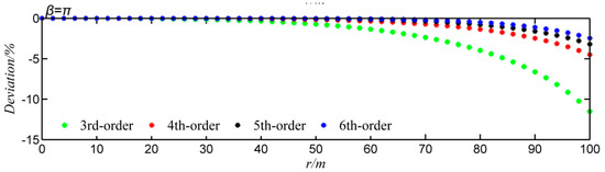 Equation (10) is obtained by expanding the Taylor series; the deviation resulting from the expansion items increases rapidly when the length of blade is larger than 60 m. Generally, it will expand to the third item in the actual computing application, and the fourth item will be ignored. When the length of blade reaches 100 m, under the condition that the azimuth angle of the blade is π, the third term deviation is about −11.5%, and the fourth term deviation is about −4.6%. As shown in Figure 4, it can be seen that with the increase of R, the fourth term in the expansion of the Taylor series can no longer be ignored as high-order infinitesimal, so this paper expands to the fourth term when building the model.