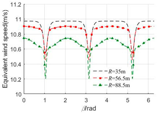 It can be seen from the foregoing analysis that, due to the existence of wind shear and tower shadow effect, the wind speed contains a sinusoidal component whose frequency is three times the frequency of the frequency, and the component can be replaced by ; the part other than this component can be represented by . Therefore, the equivalent wind speed can be rewritten as: