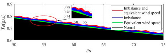 To study the variation of the diagnosis characteristics under different degree of fault, b is set to 1%, 6%, and 10%, respectively. Figure 8 and Figure 9 show the time-domain plot of Te and Pe in normal conditions, only 10% mass imbalance, only the equivalent wind speed condition, and the equivalent wind speed, and 10% mass imbalance coexistence condition.