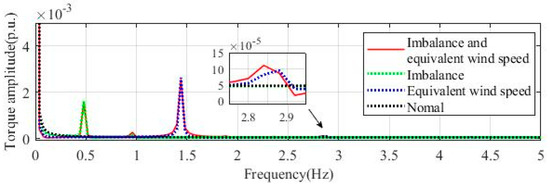 It can be found from the Te and Pe spectrum diagram that the Te and Pe signal of the imbalance fault has a sharp peak at f = 0.48 Hz, which corresponds to the frequency of the rotor rotation. When magnified, the spectrum can find a smaller peak at 2P; these conclusions are consistent with the conclusions in [11]. When the equivalent wind speed is added, it can be observed that, at 3P (f = 1.44 Hz), a sharp peak appears, and its amplitude is even slightly higher than 1P; after the figure is partially enlarged, it can be observed that there is also a much smaller peak at 6P (f = 2.88 Hz), which results from the equivalent wind speed. Therefore, in the actual fault diagnosis, when the amplitude at 3P is greater than 1P, it can also be judged that the blade mass imbalance fault has occurred.