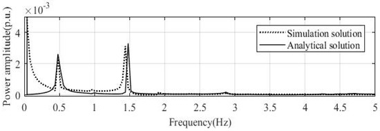 Using the equation derived from the analysis, the calculation data of Pe at 6% imbalance condition under the equivalent wind speed was obtained, as was the spectrum curve. The spectrums obtained from the calculation data and the simulation data are drawn in the same figure, as shown in Figure 12. It can be seen that the two curves are very close, so it can be proven that the conclusions obtained by the simulation have a high reference value.