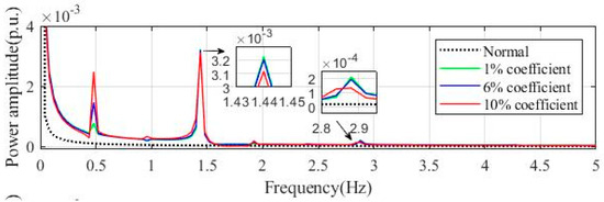 The electromagnetic power signals of the three different degrees of imbalance faults, at equivalent wind speed and the electromagnetic power signals and under normal conditions, are analyzed by FFT and plotted in the same figure. As shown in Figure 13, it can be seen that the greater the degree of fault is, the larger the amplitude at 1P, and the more obvious the fault characteristics. However, the amplitude at 3P and 6P does not change much with the increase of the degree of imbalance fault. Therefore, it is known that the faults at the 3P and 6P are mainly due to the existence of the equivalent wind speed, and this is the same as the conclusion drawn in the previous chapter.