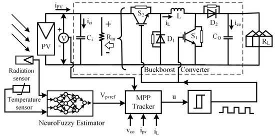 The non-inverting DC-DC buck-boost converter either steps up or steps down voltage from its input (PV array) to its output (load), in order to force the PV array to operate at the MPP. The converter is periodically controlled by its switching period, T where: ; is the ON time and is the OFF time, over this period. The duty ratio of the converter is defined as: . The input capacitor, , is used to limit ripples in the converter input voltage, while the output capacitor, , is used to limit ripples in the output voltage. Throughout this paper, the converter is assumed to be operating in continuous conduction mode (CCM). The equivalent circuit of the non-inverting DC-DC buck-boost converter is shown in Figure 1, as a part of the complete model of the system [28].