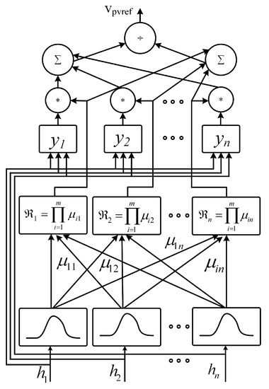NeuroFuzzy network used in this article is based on Takagi-Sugeno fuzzy inference system, which is shown in Figure 2, while a NeuroFuzzy-based nonlinear 3D-plane for PV array is depicted in Figure 3. The NeuroFuzzy network used has two inputs i.e, temperature and irradiance. The input layer is the fuzzification layer which has three Gaussian membership functions for each variable. The output layer has a linear equation for each rule. The NeuroFuzzy algorithm generates reference of the peak power voltage to extract maximum power from the PV array under varying environmental conditions.