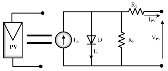 The PV cell have p-n junction similar to a diode, which produces the electric power by using photons. A PV cell consists of a series resistance, , a shunt resistance, , current source, and a diode, D as shown in Figure 4. In order to extract the parameters of the equivalent electrical circuit, it is required to know the PV current-voltage or power-voltage curve in standard conditions of measurement (SCM). As has a high value and has a low one, so to simplify the study both can be neglected. The PV array electrical characteristics are often determined by the subsequent equations [27].