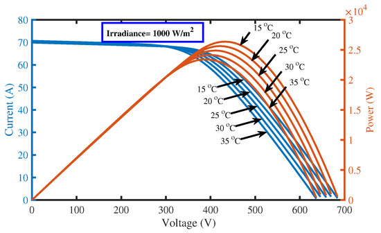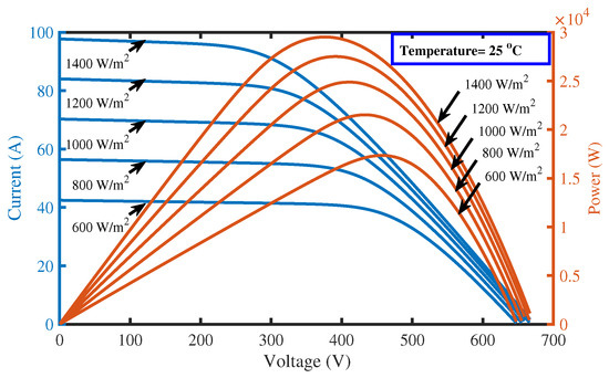 The PV array used in this paper consists of 4 strings which are connected in parallel. Every string consists of 4 modules connected in series. So, the total number of PV modules used in this paper are 16. One module has a power of 1555 W. So, the maximum power which can be delivered by this PV system is: 1555 × 16 = 24,880 W.