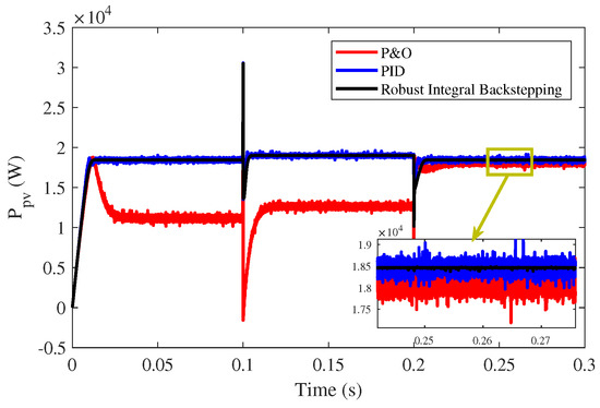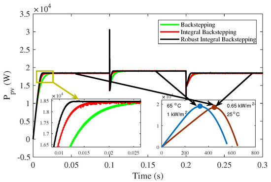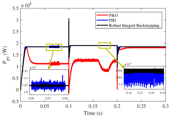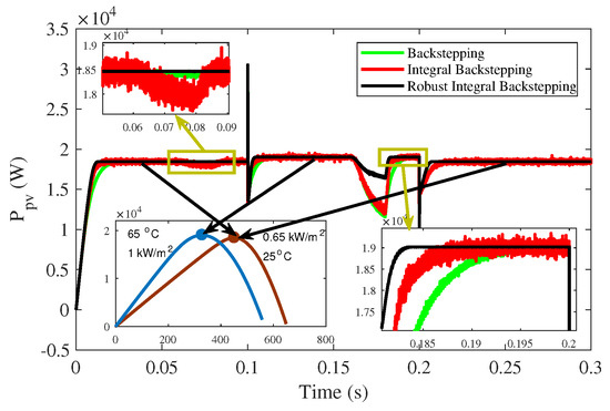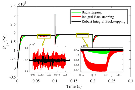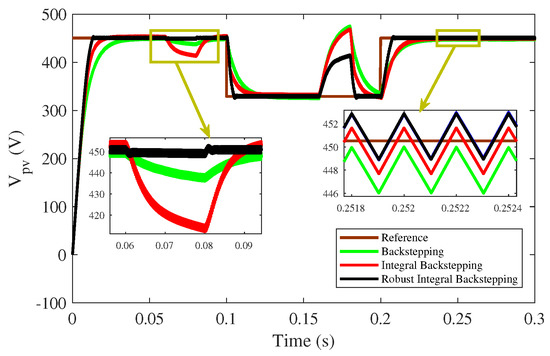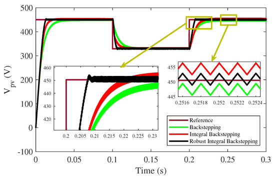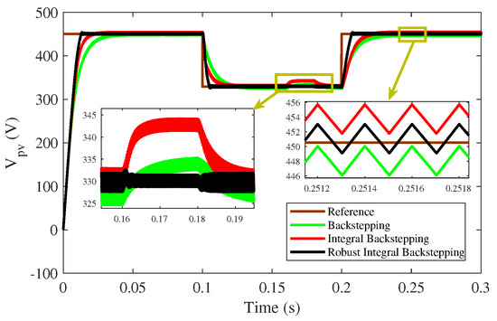 The PV output voltage deviates from the , due to occurrence of faults in the system, as shown in Figure 14. However, the proposed controller deviates from 329 V to 415 V, which is minimum deviation from compared to integral backstepping from 329 V to 470 V and backstepping from 329 V to 476 V, in the time interval (s). Also, in the time interval (s), a fault deviates the backstepping controller from V to 412 V and integral backstepping controller from 450 V to 412 V, while the proposed controller shows robustness against fault. It can be observed that the proposed controller reaches steady-state faster than other controllers. Besides, a maximum steady-state error is observed in backstepping controller after faults occurrence.