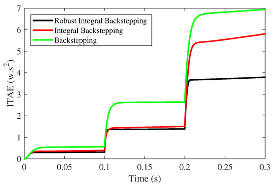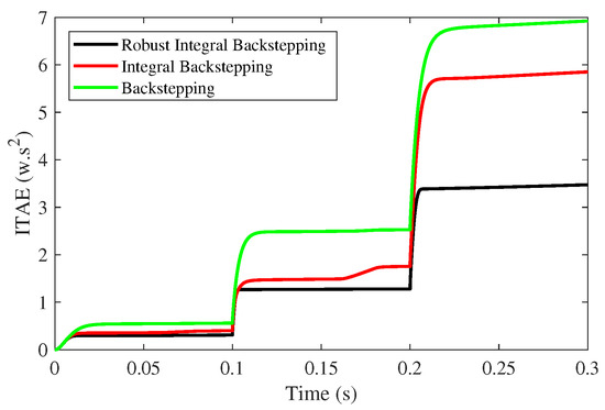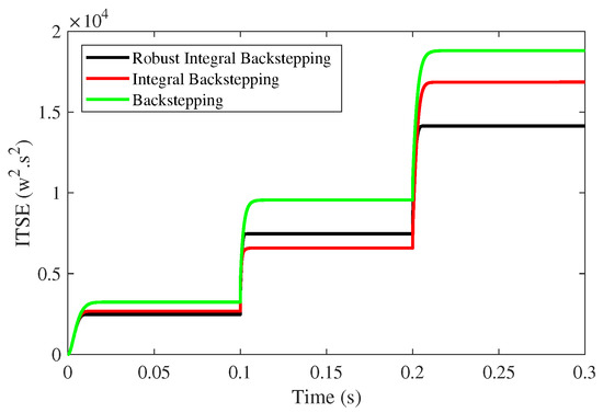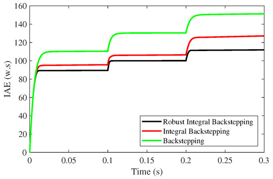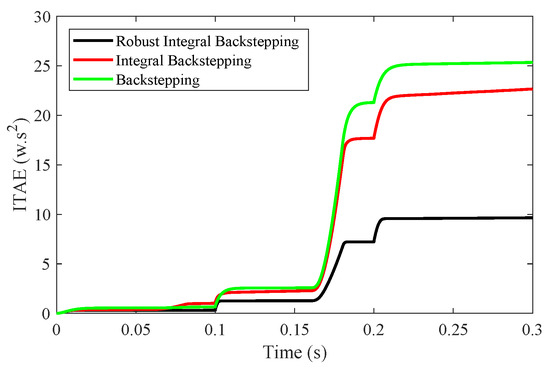 The performance indexes of PV system (IAE, ITAE, ISE and ITSE), as shown in Figure 16, Figure 17, Figure 18 and Figure 19 validate the effectiveness of the proposed control scheme. Also, maximum power is transmitted to load by the proposed robust integral backstepping controller with efficiency of more than , outperforming the other MPPT techniques.