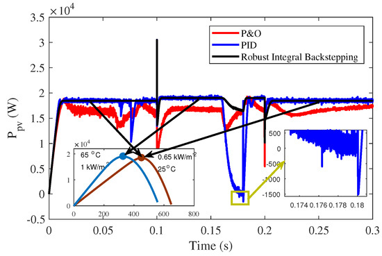 In this case, the performance of the PID and P&O are compared with the proposed robust integral backstepping under the same test (robustness to uncertainties under climatic changes).