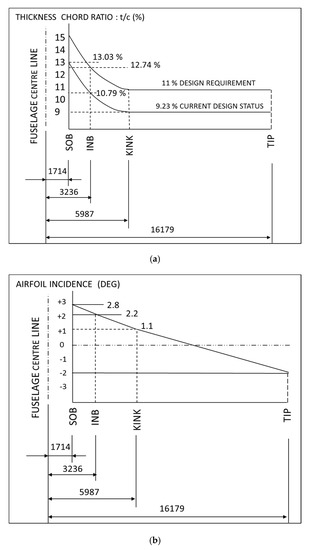 The W-ATRA wing is generated using three airfoils: (1) side of the body (SOB), (2) inboard (INB), and (3) outboard (KINK) airfoil. The SOB and the INB airfoil are designed proximate to the root of the wing. Figure 3a,b illustrate the wing thickness and twist distribution respectively along the wingspan. It is evident that the outboard airfoil is at 5.987 m from the fuselage centerline. The angle of incidence at this profile is 1.1° and the thickness to chord (t/c) ratio is 9.23%. The same t/c ratio is maintained until the wing tip; however, the angle of incidence varies linearly until −2°. The length of the outboard airfoil is 3587 mm at the wing break station. The angle of incidence of this airfoil varies from −2° to 1.1°.