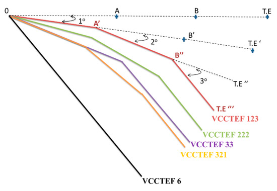 Figure 4 shows the schematic of the three-segment flap each segment length is denoted by “cf”. Since the total flap length is 30% of chord (c), each cf is 10% of total chord length. The configuration of baseline airfoil is designed with no flap deflection, i.e., it has a zero deflection angle with respect to the horizontal line. The VCCTEF 123 indicates that there are three segments of the flap. The first segment is deflected at 1° from the horizontal line; the second segment is deflected at 2° from the first segment, and the third segment is deflected at 3° relative to the second segment (see Figure 5). The same jargon applies to the VCCTEF 222 and VCCTEF 321. The VCCTEF 33 is designed such that it has only two segments each deflected at 3° relative to the horizontal line and the first segment respectively. The VCCTEF 6 configuration is a variable camber flap with single deflection of 6° relative to the horizontal line.