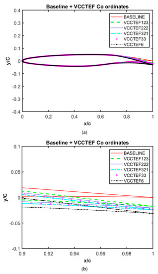 (a) Comparison of baseline coordinates with VCCTEF airfoils and their (b) enlarged view at the trailing edge.