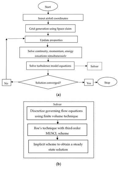 In the present work, the computational fluid dynamics (CFD) commercial software, ANSYS FLUENT V.17 is employed to perform the numerical simulations and its algorithm is illustrated in Figure 7. The airfoil coordinates in two–dimensions are normalized with the airfoil chord length. These coordinates are increased using the X–foil package to have a smoother profile of airfoil. The flow domain is divided into infinitesimal control volumes using Cartesian mesh. This mesh is generated using an in-built space claim package in ANSYS. The governing equations of continuity, momentum, and energy are solved simultaneously by using the density-based solver. The turbulence model equation is solved by using the formerly updated values of flow variables such as velocity, pressure, and temperature. The standard one-equation Spalart-Allmaras (SA) turbulence model is used to calculate the eddy viscosity [21]. The linearization of the coupled continuity, momentum, and energy equations produce a system of equations with unknown properties such as pressure, velocities, temperature and turbulent eddy viscosity. The inviscid flux terms are computed using Roe’s flux-differencing splitting method using 3rd order MUSCL scheme [22]. The implicit lower-upper symmetric Gauss-Seidel approach is used to advance the solution in time for all the variables in the control volumes to reach the steady-state solution. A Courant–Friedrichs–Lewy (CFL) number of 0.7 is used to achieve a converged solution. All the simulations are initialized with a constant free-stream temperature, pressure, and velocities. It is assumed that the air obeys an ideal gas law and the value of viscosity is adjusted to match the desired free stream Reynolds number (Re∞). The computations are stopped when the mass residual is reduced to an order of magnitude of six.