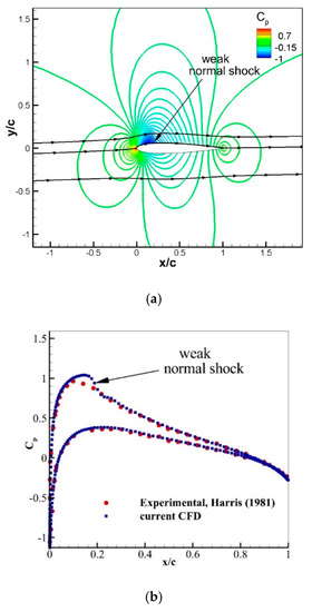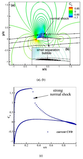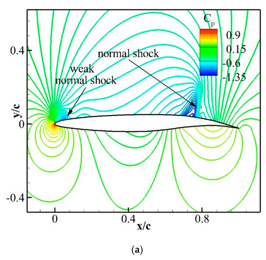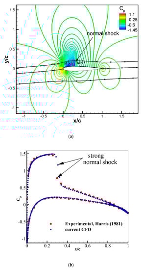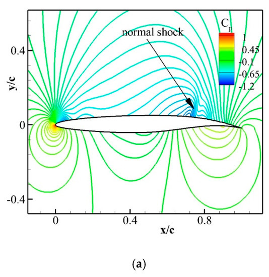 The flow over the NACA0012 airfoil is computed, and the results are compared to the available experimental data [23] for the validation at free stream transonic Mach number and Reynolds number of 0.7 and 9 × 106. The C–grid with 1122 × 200 points is generated with flow domain extending up to 25 chord length. The flow is computed at different angles of attack varying from 0° to 4.8°. The experiments showed a stall at an angle of attack of 5°. The computed coefficient of pressure contours and surface pressure distributions are shown in Figure 8, Figure 9 and Figure 10 for the angle of attack = 1.5°, 3.1°, and 4.8° respectively and compared to the experiments [23]. A weak normal shock is formed on the upper surface of the airfoil and is marked in Figure 8a. The computed surface pressure coefficient matches with the experimental data on the upper and the lower airfoil surfaces (see Figure 8b), however on the upper surface in the regions near to x/c = 0.16, CFD data shows higher values than the experiments. This normal shock is absent in the experiments because of the three-dimensional (3–D) relieving effect. In a two-dimensional (2–D) computational flow, sharp gradients of the normal shock wave are formed. The computed Cp contour shows that the normal shock location (see Figure 9a) is observed in the downstream flow direction in comparison to the experimental data. Figure 9b illustrates that the CFD results are in a good agreement with the experimental data with a small deviation of Cp at x/c = 0.28 on the upper surface. An increase in the angle of attack results in a stronger normal shock on the upper surface, as shown in Figure 10a by flow contours of the coefficient of pressure. Figure 10b depicts that an adverse pressure gradient across the normal shock wave results in flow separation. Figure 10c illustrates that the highest jump in surface Cp across the shock is observed at x/c = 0.32.
