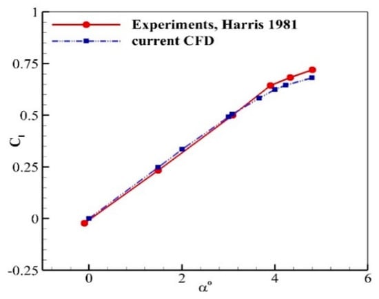 Variation of computed Cl with the angle of attack for the NACA0012 airfoil at Mach = 0.7 and Re∞ = 9 × 106, compared with the experiments [23].
