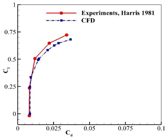 The computed Cl variation with angle of attack for the NACA0012 airfoil at Mach = 0.7 and Re∞ = 9 × 106 is compared with the experiments [23] in Figure 11. The current computed Cl agrees well with experimental data up to 4° angle of attack and beyond this angle, the CFD results show 5% fewer values than experiments. Figure 12 shows a polar drag plot for the NACA0012 airfoil. The CFD results match with experiments for a lower angle of attack up to 2° and show a maximum deviation of 7% at higher angles. This difference can be attributed to the fact that the experiment fixed the transition location around 5 percent of the chord from the leading edge, while the present computations are carried out with a fully turbulent incoming flow with SA turbulence model. The second reason in deviation of CFD and experiments is that the normal shock is unsteady in nature when it interacts with the boundary layer on the airfoil surface. This normal shock–boundary-layer interaction is one of the sources of flow unsteadiness. The modelling of this flow unsteadiness and implementing in the turbulence model can improve the separation bubble size, and hence can improve the computed shock location. This unsteadiness is not modelled by the current SA model and therefore gives an error in the Cd and Cl calculations. The CFD results will be improved in our future studies by using advanced SA and k-ω turbulence models, which accounts for this unsteadiness [24,25,26,27].