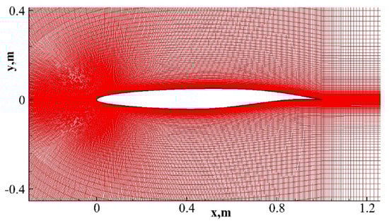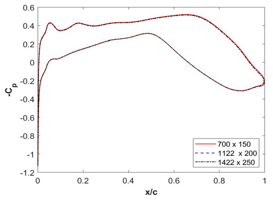 A grid independence study is done by taking three different C–grids of 700 × 150, 1122 × 200 and 1422 × 200, as shown in Figure 13. It is observed that the variation of surface pressure coefficient overlaps with each other for these grids (see Figure 13). The near-wall distance of 1.6 × 10−3 m is taken and the value of y+ is less than 1. In the current study, the grid size of 1122 × 200 is used to reduce the numerical errors [22]. The number of grid points around the airfoil is 922 points. The same grid is used in the validation of NACA0012 airfoil in the former simulations. Figure 14 shows the grid around the baseline airfoil.