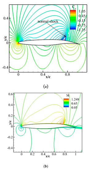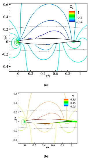 Computed (a) coefficient of pressure and (b) Mach contours for flow over the baseline airfoil at a zero angle of attack.