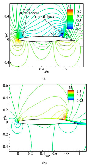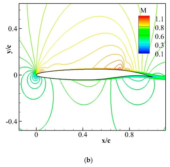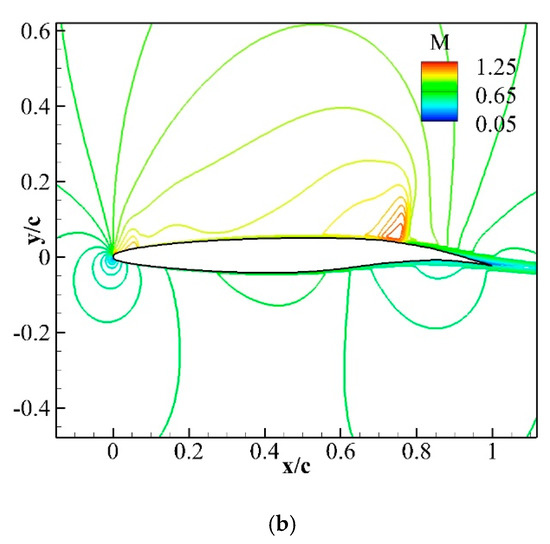 The coefficient of pressure and the Mach contour plots of the baseline and various VCCTEF configurations at a zero angle of attack are illustrated in Figure 15, Figure 16, Figure 17, Figure 18, Figure 19 and Figure 20. As the deflection of trailing edge increases (see Figure 6b) the normal shock intensity on the top surface of these airfoils also increases in the same order of deflection and are marked in the respective contours of the coefficient of pressure. The maximum Mach number on the upper surface of the airfoil, near the first hinge point, also increases in the same order.