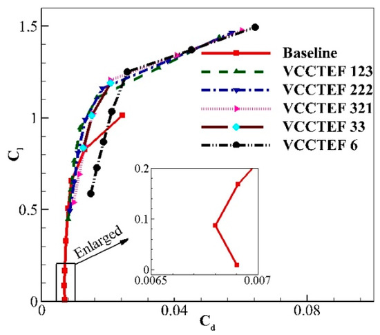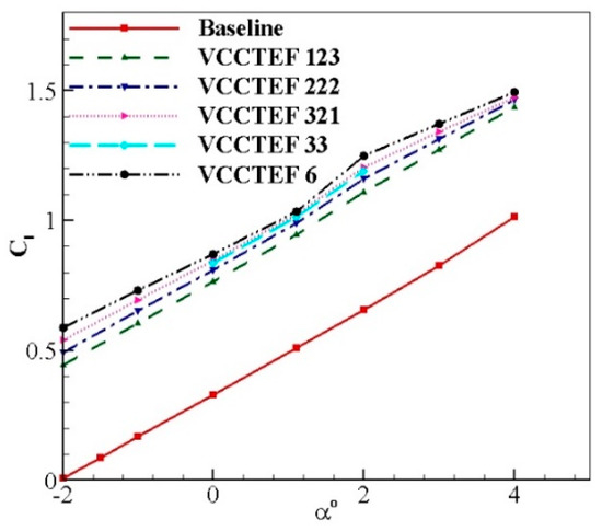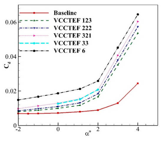 The VCCTEF 6 configuration is showing the highest level of drag compared to other configurations at any given angle of attack (see Figure 22). Among the five configurations of VCCTEF, the lowest drag is of VCCTEF 123. It is worth noting that VCCTEF 321 and 33 almost coincide with each other. The study of the variation in the Cd with various angle of attack is important for initial assessment of the VCCTEF configurations before the computations of the 3–D geometry begins. All the VCCTEF configurations result in an increase in the lift coefficient in comparison to the baseline airfoil (as observed in Figure 23) with the VCCTEF 6 showing the highest value at each angle of attack.