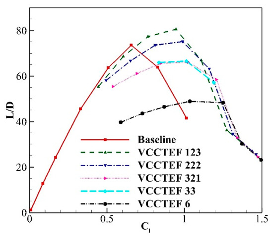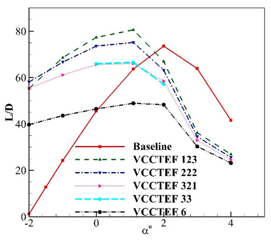 The L/D value of all the VCCTEF configurations (except VCCTEF 6) is better than the baseline configuration for the angle of attack in the range of −2° to 1° (as seen in Figure 25). However, beyond 1.5°, no configuration outperforms the baseline.