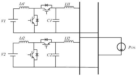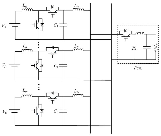 In general, DC microgrids include distributed micro-sources, batteries, constant power loads, and a large number of power electronic converters. Among them, each battery is connected to the bus through the bidirectional DC/DC converter, and the droop control strategy is used to realize the power distribution without communication; the distributed micro-sources often work in the Maximum Power Point Tracking (MPPT) mode and can be regarded as a negative constant power load in a short time [17]. Therefore, the distributed micro-sources and constant power load can be uniformly equivalent to a constant power load. The typical structure of a DC microgrid was the system studied in this paper, and its structure is shown in Figure 1.