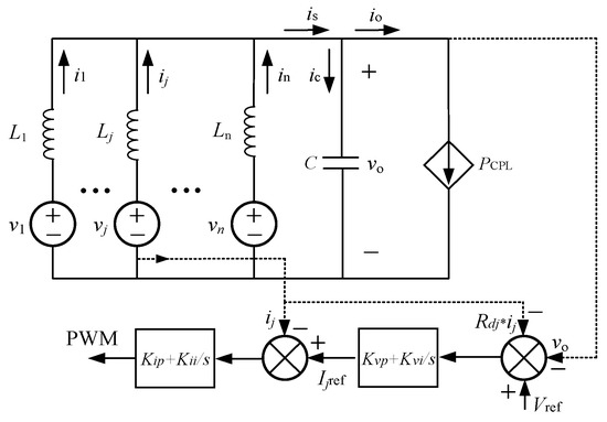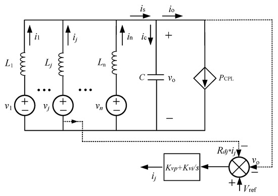 In Figure 2, Vref is the voltage reference value; vo is the bus voltage; vj and ij are the output voltage and output current of the jth micro-source, respectively (j = 1,2…n); io, ic are the load current and the capacitor current, respectively; is is the sum of the output currents of all micro-sources; and PCPL is the power of the equivalent CPL. The mathematical model of the system is as follows:
