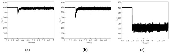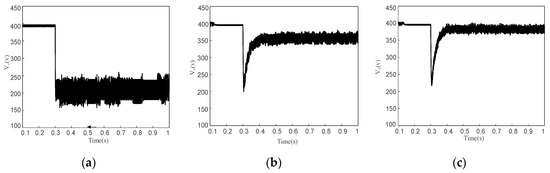 Waveforms of the DC bus voltage in case of (a) PCPL changes to 25,400 W; (b) PCPL changes to 34,300 W; (c) PCPL changes to 36,100 W.