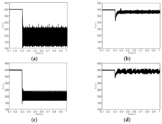 Waveforms of DC bus voltage with (a) No.1 set of parameters; (b) No.2 set of parameters; (c) No.3 set of parameters; (d) No.4 set of parameters.