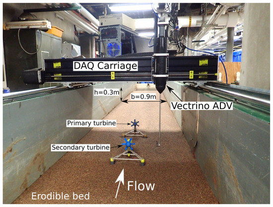 We carried out the experimental measurements in the tilting bed flume at the Saint Anthony Falls Laboratory (SAFL) at the University of Minnesota. The channel has dimensions of 14.6 m long and 0.9 m wide, a slope set at 0.1%, quartz sediment moving bed ( m), and a 3-axis flume-traversing data acquisition (DAQ) carriage, shown in Figure 1. We set the water height, h, at 0.3 m in order to have a similarity of the Froude number () between the scale model and the operation conditions of the turbine prototype, and the other main dimensionless parameters (e.g., Reynolds and tip speed ratio (TSR)) stayed in similar ranges. Under these conditions, the values of local shear stress were below the critical value according to the Shields curve [34]. Therefore, all experiments were made with clear water conditions.