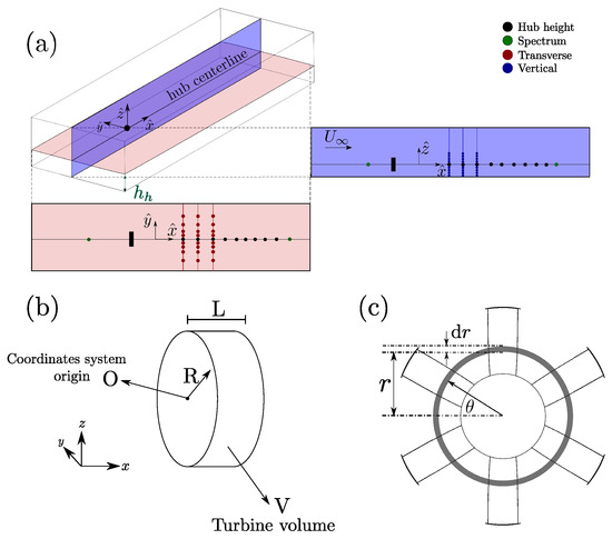 (a) Points measured for both cases. Black: hub height () for the deficit at the centerline, green: long exposure for the energy spectrum, red: transverse profiles, blue: vertical profiles. The disk on this image represents primary turbine. (b) Schematic view of the cylindrical volume V that represents turbines. Forces calculated from BEM theory are only applied over nodes inside this volume. (c) Schematic view of the turbine rotor and differential radius used on BEM.