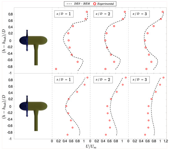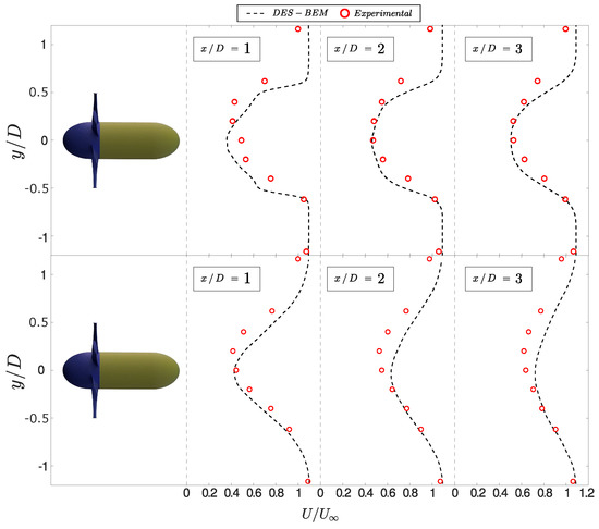 For the ST case (see Figure 3a), the simulations showed a difference of 30% and 14.4% compared to the experimental values in the near field, i.e., two points located at 0.5D and 1D, respectively. This difference was due to the inability of the BEM approach to reproduce the near wake [39]. From a distance of three diameters downstream of the turbine, the values obtained showed an excellent agreement with the experimental measurements, even though we did not represent the hub, nacelle, or support structure in the BEM approach. The shape of this curve also coincided with results obtained in previous investigations [32,40].