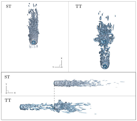 Comparing the instantaneous analysis of the coherent structures produced by the downstream turbine in both cases, we saw a shorter wake in the TT case that coincided with the mean velocity field of Figure 3, Figure 4 and Figure 5. As reported by Blackmore et al. [44], the wake length was smaller when there was a structure that increased the turbulent intensity upstream of the MHK device, since it favored turbulent momentum transport that made the longitudinal velocity recover at a shorter distance.